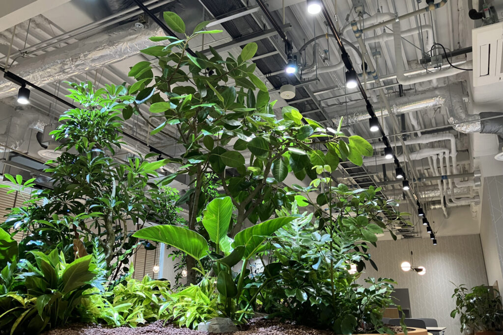 ラウンジやエントランスといった人の滞留が多い空間には十分な緑量を確保した上で、照度分布図を用いて植物育成用LEDライトを導入し、植物が健やかに育つ環境を整えました。