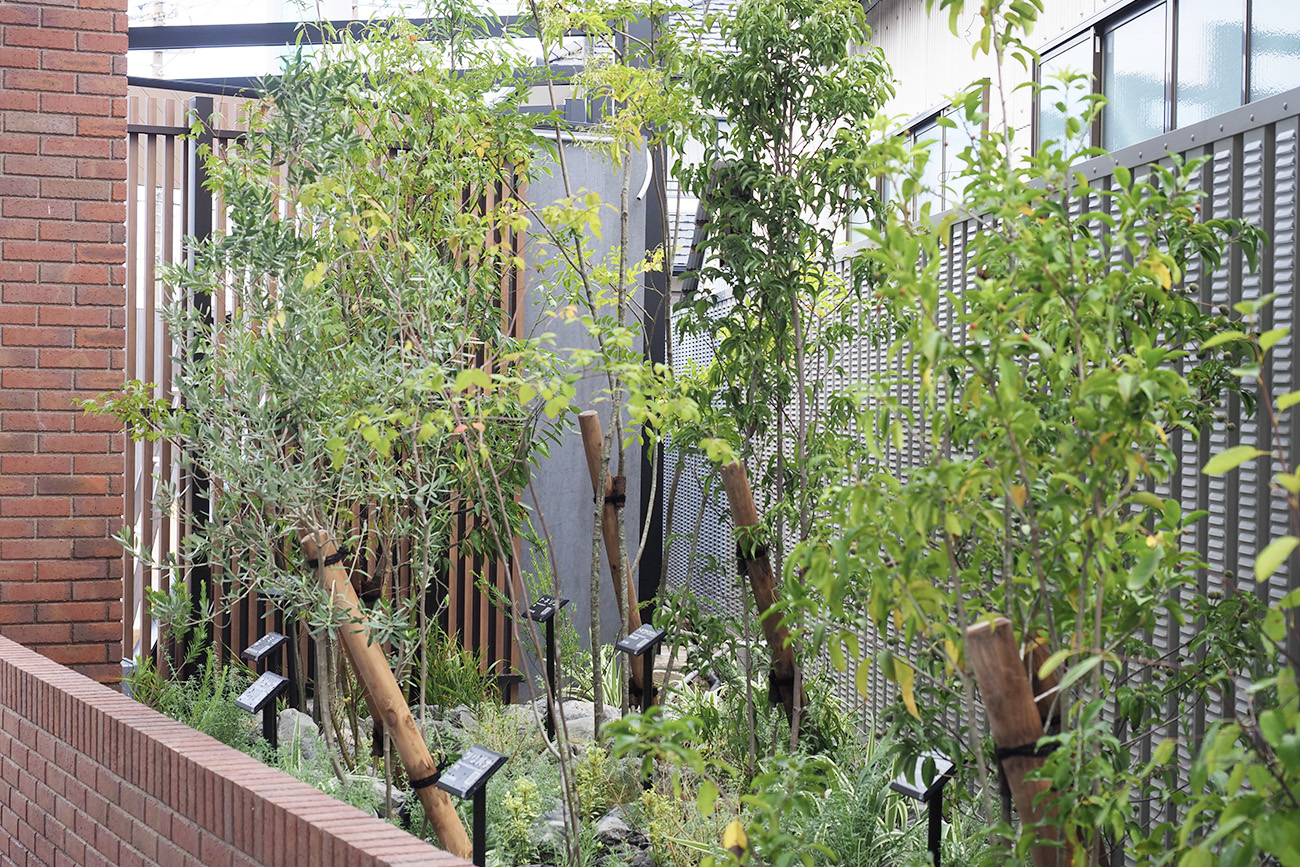 レンタルオフィス テラスにおける外構植栽事例となります。樹種、プランター、照明器具、灌水装置、と全てをトータルでコーディネートし、外観だけでなくオフィス内から見える景観にも配慮し施主様のご要望にお応え致しました。
