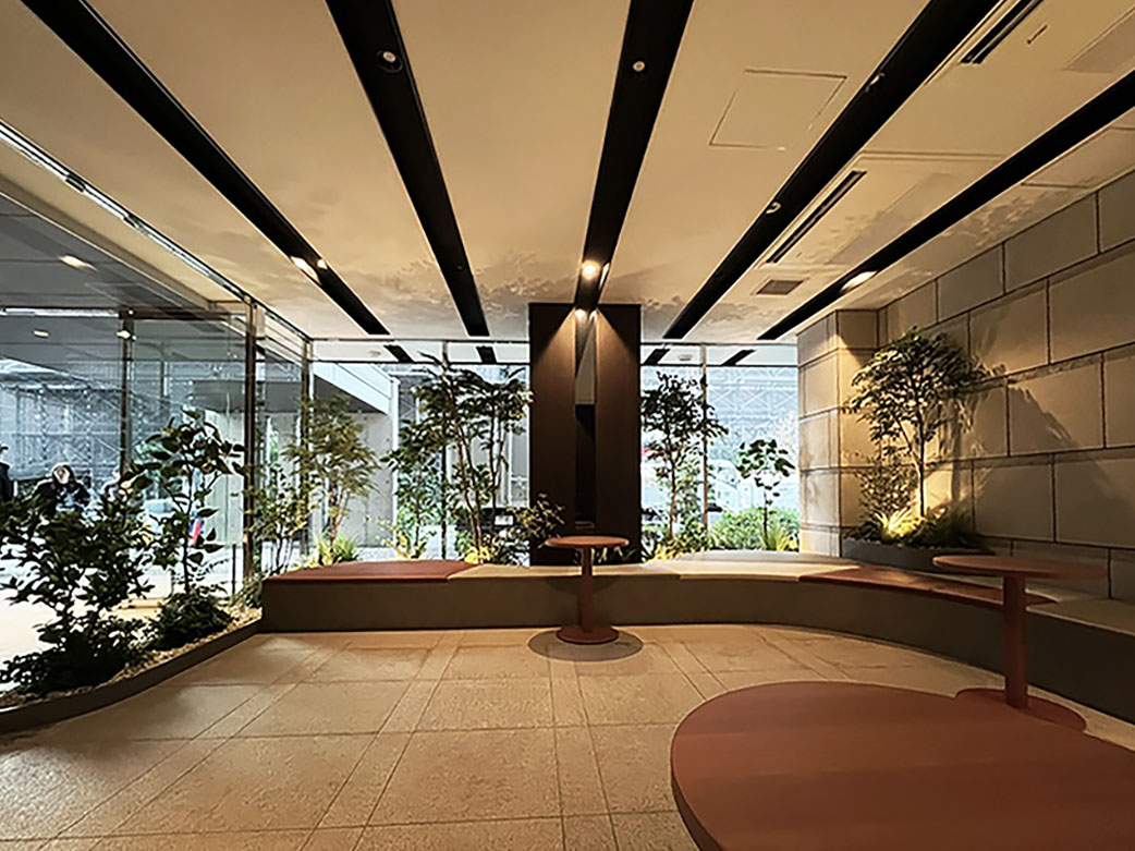 窓の広いフリースペースに、外構の緑とつながるような心地よい憩いの場をデザインしました。