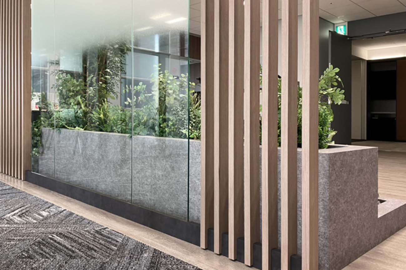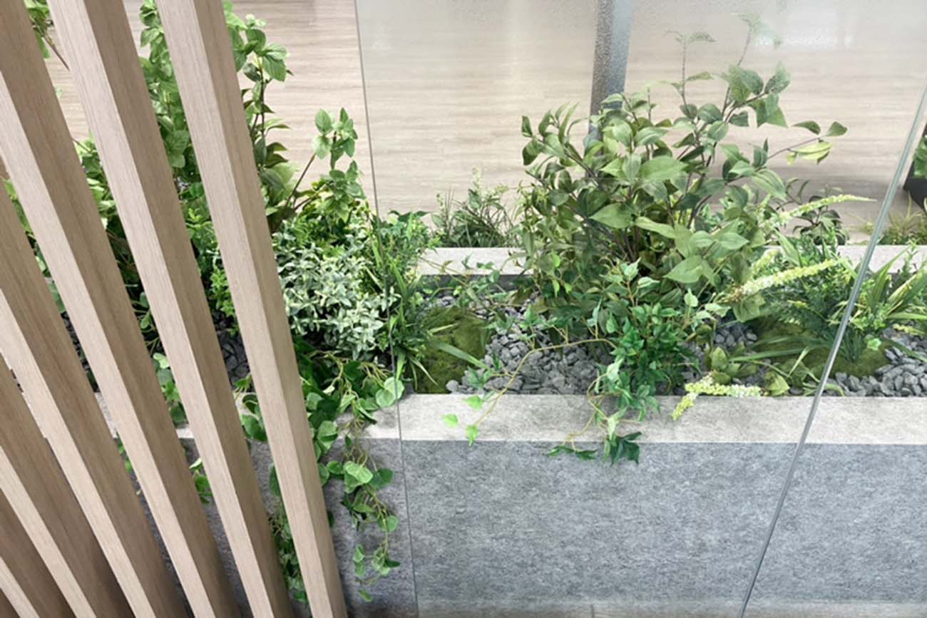大きな窓からの採光、ガラス・木目のルーバーで仕切られた設えの中で、グリーン部分を計画、施工しました。